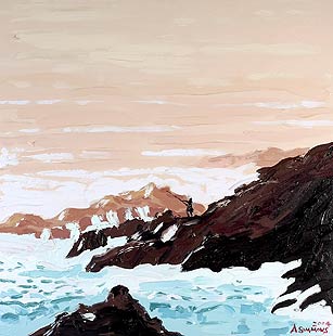 It was the end of one of those sticky summer days, when the air is thick and the light is filtered. A rare summer swell crashes over the rocks draining away in heavy waterfalls.